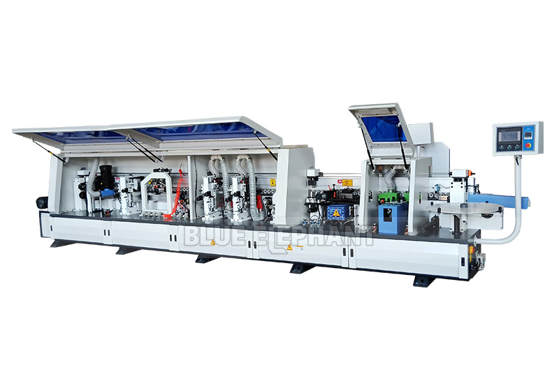 2、全自動封邊機具有:拋光2—拋光1—開槽—平刮—刮邊—跟蹤修邊—精修—粗修—齊頭齊尾—涂膠封邊—預銑。