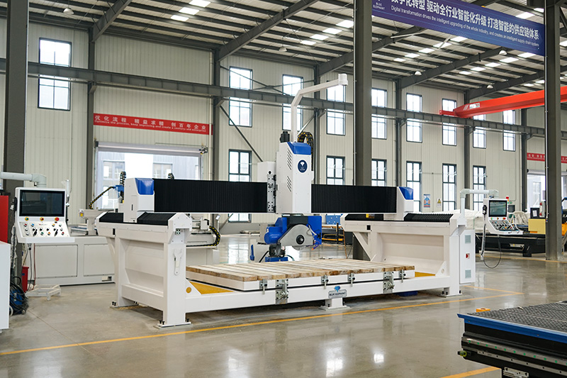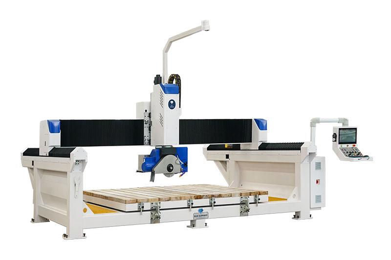 5+1 數控橋切鋸能夠以任何所需的角度和形狀對花崗巖、大理石、人造石、板巖和各種其他石材進行切割和雕刻。本機采用的藍象數控系統。